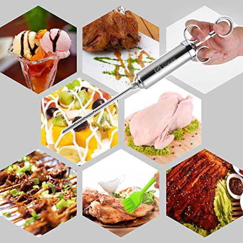 - 【Anti-Rust/Erosion/Leak & Heavy Duty for Years】100% culinary stainless steel metallic material (a little heavy injector syringe); sturdy meat injector needles, easily to pierce the toughest cuts of meats or poultry; silicone basting pastry brush working well in high cooking/grilling temperature range.