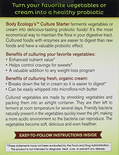 -. Binding : Health and Beauty -. Brand : Body Ecology -. EAN : 0758000100229 -. Feature : Helps control cravings for sweets / Enhanced nutrient value ...More vitamins & minerals for you / A valuable addition to any weight loss program -. IsAdultProduct : 0 -. Label : Body Ecology -. Manufacturer : Body Ecology -. MPN : BE011 -. PackageQuantity : 1 -. PartNumber : BE011 -. ProductGroup : Health and Beauty -. ProductTypeName : HEALTH_PERSONAL_CARE -. Publisher : Body Ecology -. Studio : Body Ecology -. Title : Culture Starter by Body Ecology,1oz. -. UPC : 758000100229