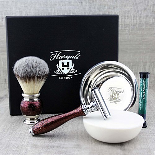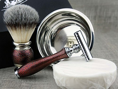 Old School Men's Shaving Set ft Synthetic Brush, DE Safety (Blades Not Included), Engraved Bowl & Soap| Gift for Him