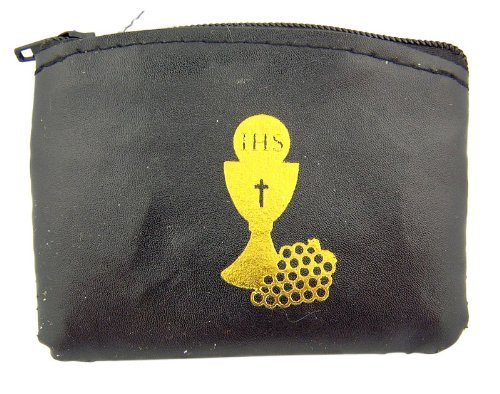 Catholic Boys First Holy Communion Gift Gold Stamp IHS Chalice with Grapes Black Vinyl 3 1/2" Rosary Jewelry Keepsake Zipper Case