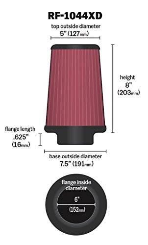 K&N RF-1044XD Universal Clamp-On Air Filter: Round Tapered; 6 in (152 mm) Flange ID; 8 in (203 mm) Height; 7.5 in (191 mm) Base; 5 in (127 mm) Top