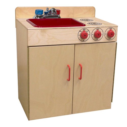 The Wood Designs WD10500 playtime sink and range combination has movable plastic faucet knobs and a plastic sink pan. The cabinet below has full-length hinges to prevent pinched fingers. It measures 24 x 25 x 15 inches (H x W x D). (H is height, the vertical distance from lowest to highest point; W is width, the horizontal distance from left to right; D is depth, the horizontal distance from front to back.) The preassembled unit is made of plywood with eased edges and corners for safety and has an ultraviolet (UV)-resistant natural finish that also resists stains and damage from cleaning solutions. This kitchen unit is Underwriters Laboratories (UL) Greenguard Gold certified for environmental safety and is suitable for use in an educational environment.