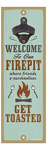 - Bottle opener sign reads: Welcome to our firepit where friends and marshmallows get toasted