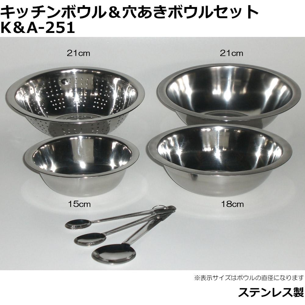 いつまでも美しいステンレス製のキッチンボウルと水切り抜群な穴あきボウル、計量スプーンの5点セット。 |