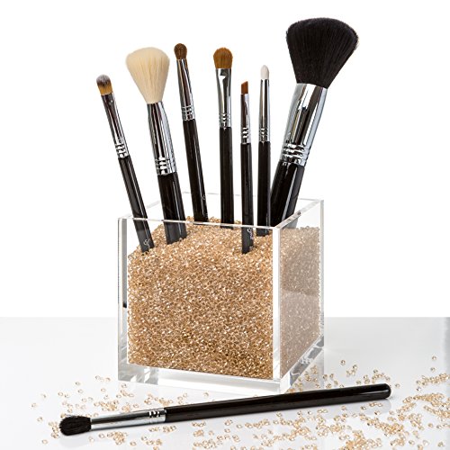 Acrylic Makeup Organizer & Counter Top Makeup Brush Cup Holder with GOLD Diamond Beads. #1 for Mac, Real Techniques, Naked Sigma, Kardashian Makeup Brushes and more...