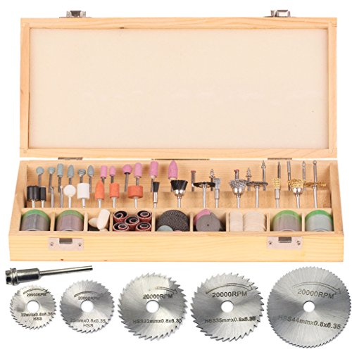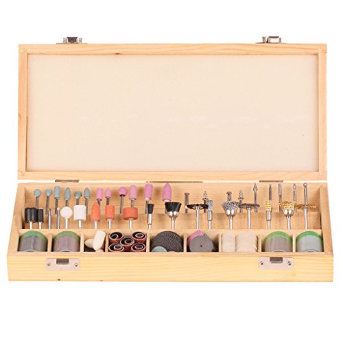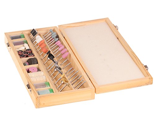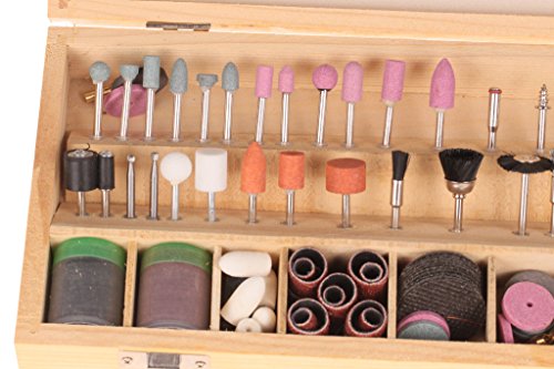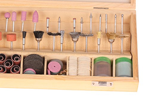 228 different rotary tool accessories, includes: sanding drums with arbors, brass wire wheels, nylon wire wheels, felt bobs, polishing wheels, fiber wheels, sanding drums, polishing rouges, cut-off wheels, etc. all in a wooden box to keep them organized