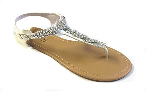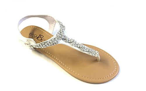 Womens T Strap Gladiator Sandals Flats shoes W/Iridescent Rhinestones (7, White Rich-14)