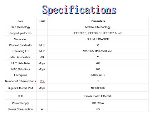 • YTMC MoCA coax adaptor can be interlinked with any networking device at your home, including but not limited to IPTV, media centers,DVRs, Xbox, PS4, Blueray players...) by transmitting Ethernet signal and video signal in one single cable. • Complied with MoCA2.0 standard, having 700Mbps PHY layer and 400Mbps MAC layer transmission rate, respectively. • One Coax In/Out port, one Video output port, one or multiple Ethernet port to meet differing networking requirement • Plug and play. • Support up to 16 adaptors to be able to communicate with each others at same time. • Supports full Ethernet speed • Uses existing coax cabling • Reduced beacon power level • Up to 1004 Mhz RF signal pass through • Has multiple frequency band, various network condition can be addressed. • Coexistence with cable TV services • Having auto and dynamic selecting main control adaptor function, main control adaptor can be automatically reselected when it's down.Feature
