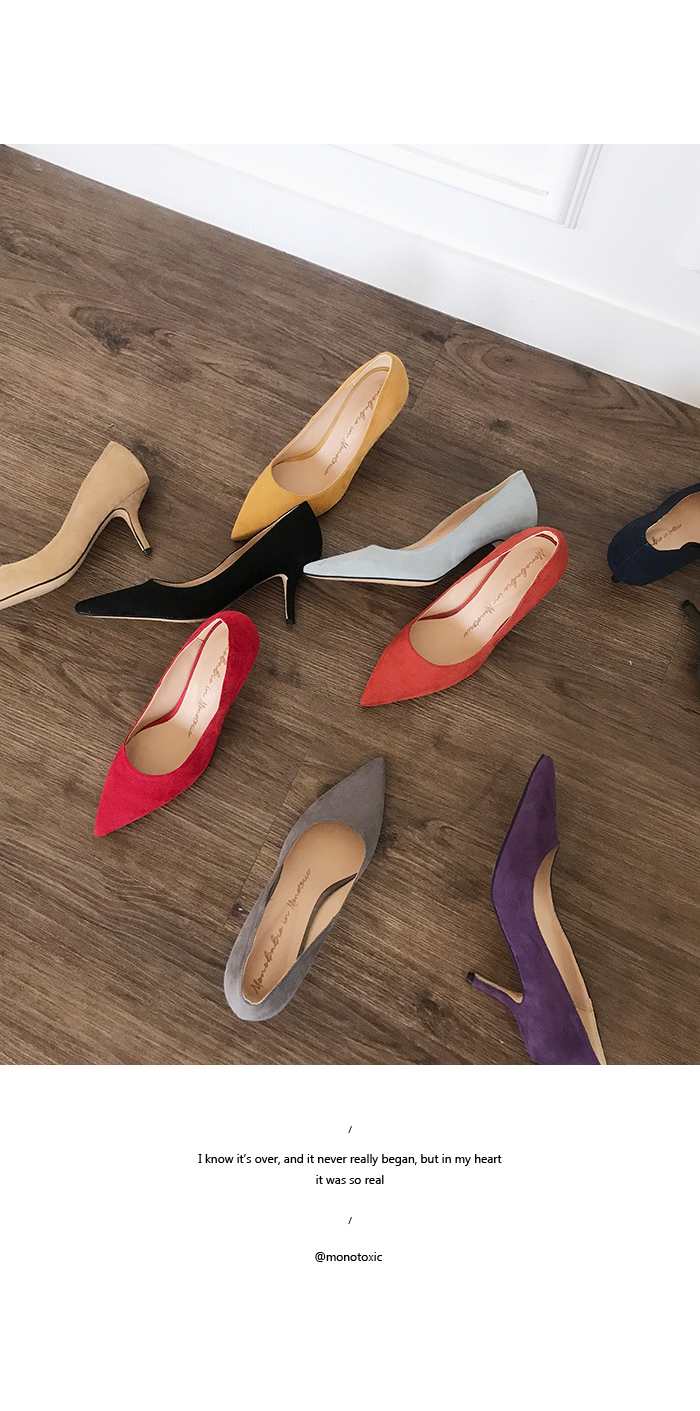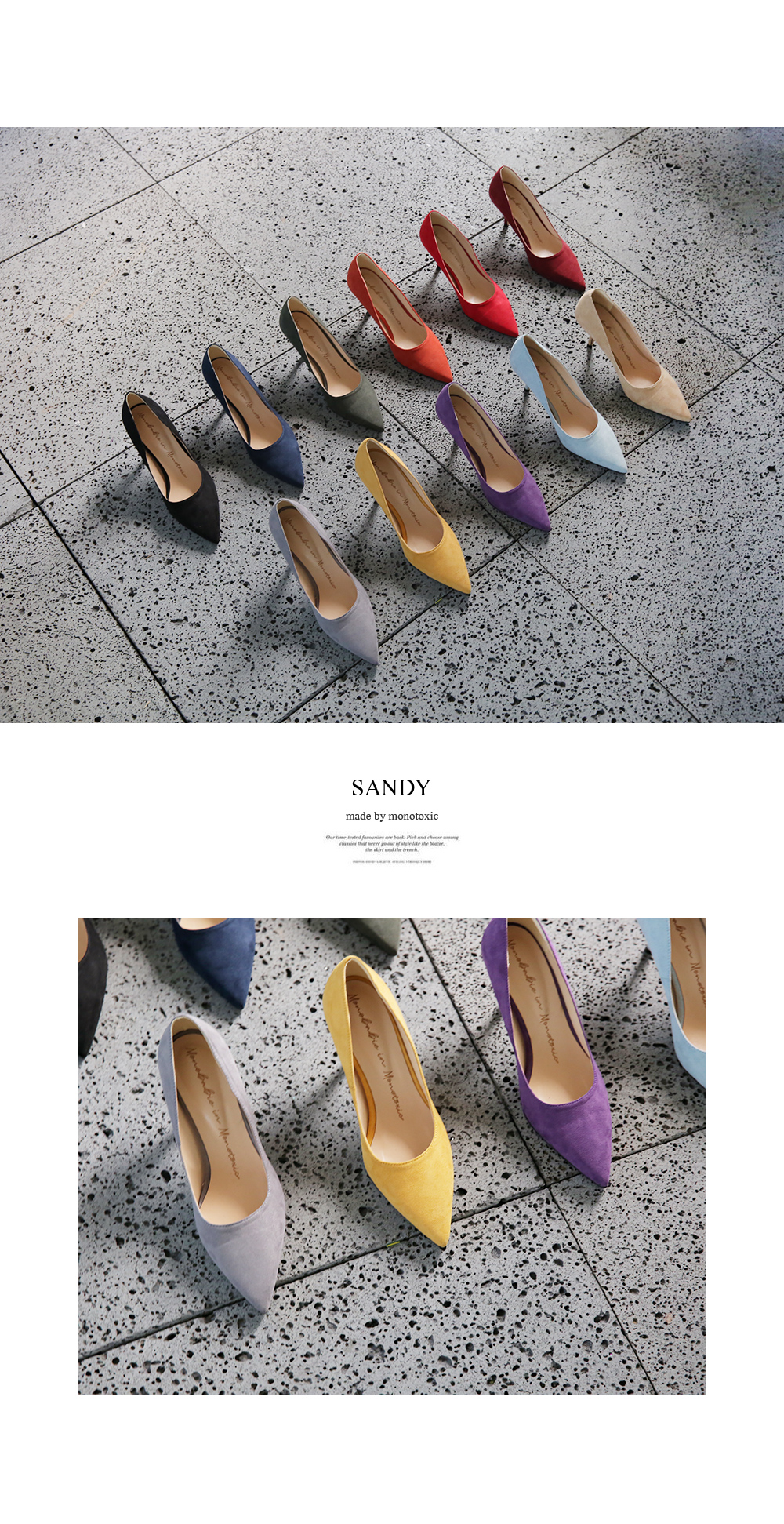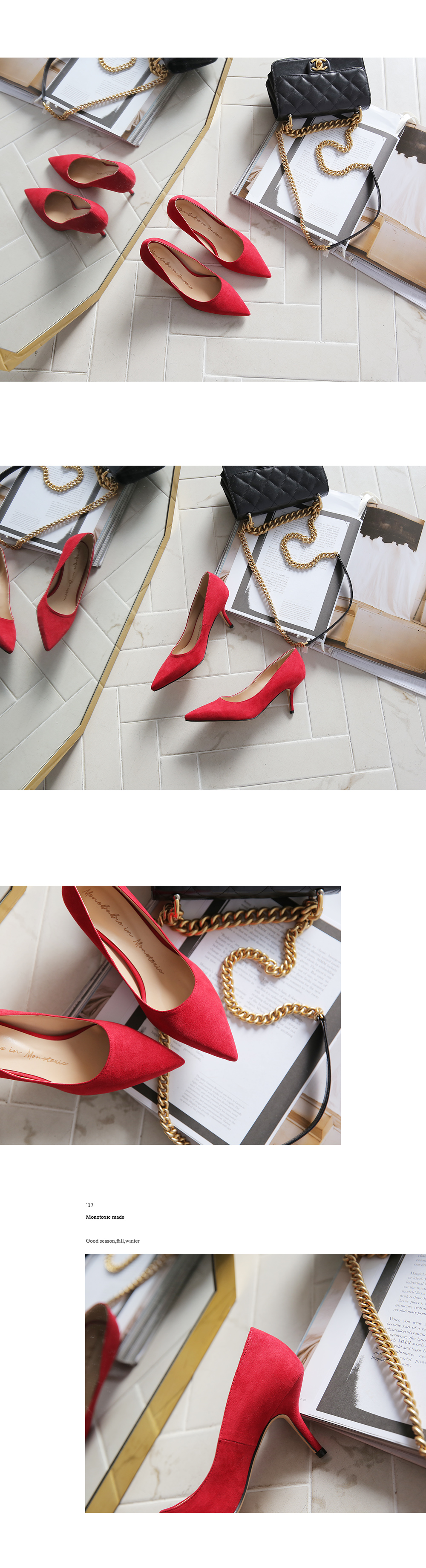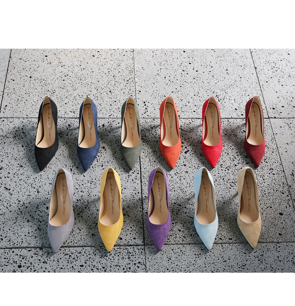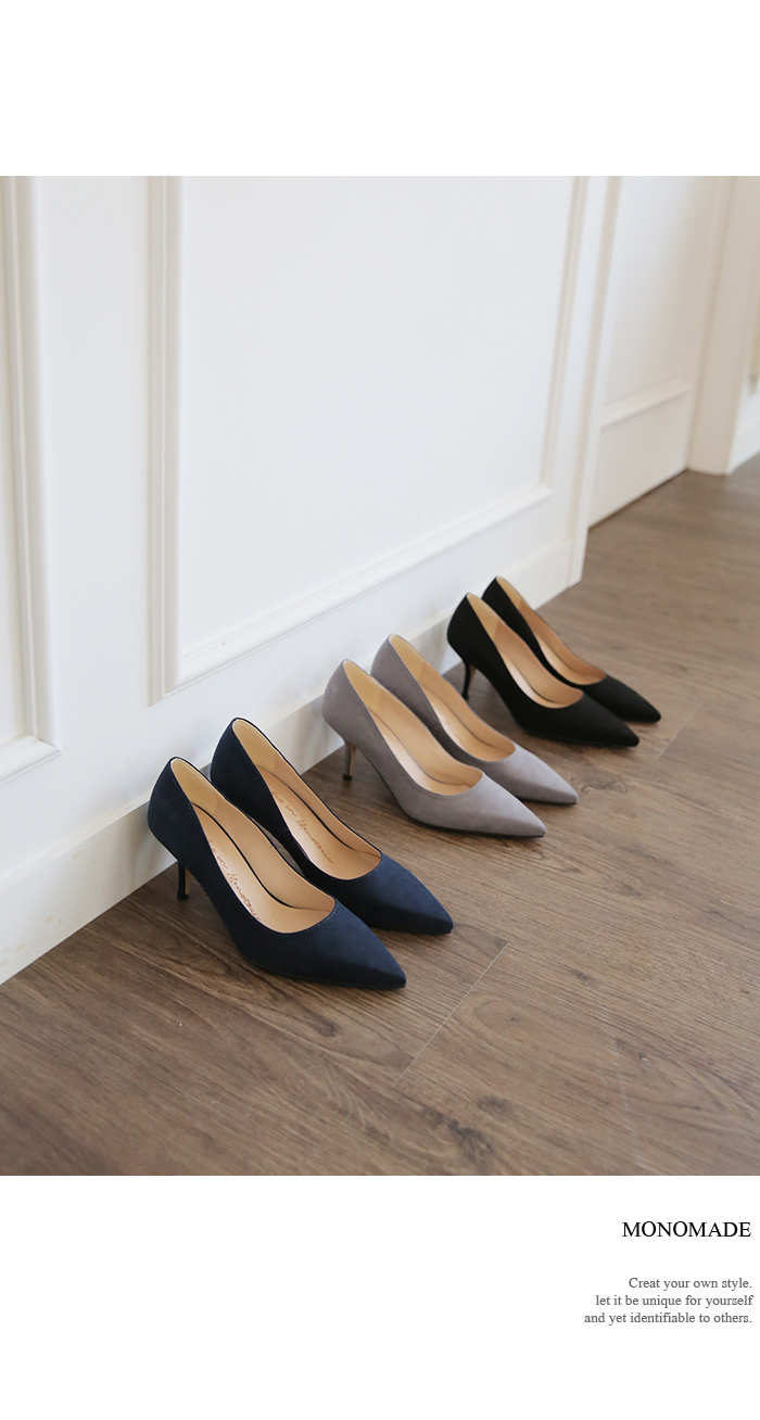 3월부터 라스트 개발 들어갔고 오랫동안 준비한 제품으로 아마 국내에서는 처음 선보이는 느낌의 쉐입이실거예요 스틸레토 코에 양사이드를 나이프로 반듯하게 밀어낸듯한 엣지를 주어 일반 스틸레토 힐 보다 더 뾰족하고 슬림하게 느껴지고 7센티 높이의 스틸레토 중에서, 브랜드에서도 시중에 나와있는 기성 디자인 중에서도 이만큼 세련되고 아찔하다 느껴진 제품을 본 적 없을정도로 자신있게 권장해드리는 제품입니다.