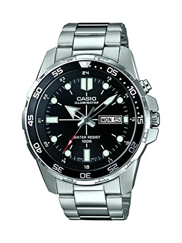 Casio 3 Hand Super illuminator 100M Analog Mens Watch - LED Light Blue. Day and date display Regular timekeeping Analog 3 hands hour minute second Accuracy 20 seconds per month Mineral Glass Spherical Glass Screw Lock Back Anti-reverse Bezel 100-meter water resistance Case bezel material Stainless steel Stainless Steel Band One-touch 3-fold Clasp.Features. Product Type - Wrist Watch. Watch Shape - Round. Watch Format - Analog. Number of Faces - 1. Watch Case Material - Stainless Steel. Wrist Band Material - Stainless Steel. Wrist Band Type - Bracelet. Wrist Band Lock Type - Fold Over Clasp. Features - LED Light Calendar Unidirectional Bezel. Water Resistance - 328.08 ft.. Durability - Water ResistantFeature