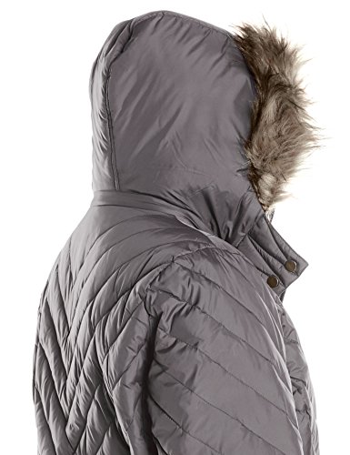Long quilted coat featuring hood with faux fur trim and full-length zipper with snap placket cover