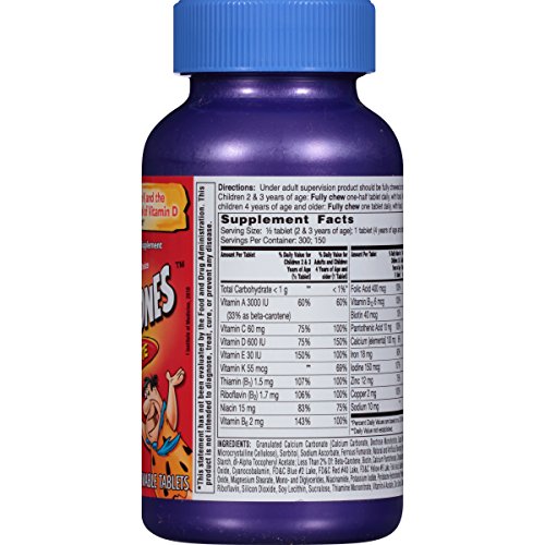 Flintstones Complete Chewable Multivitamins offer a wide range of nutrients in easy-to-chew, fruit-flavored tablets. These daily multivitamins provide vitamins and minerals that growing bodies may need. Flintstones Chewables work to support energy by helping convert food to fuel, while also supporting bone health, immune health, and eye health.* Flintstones Chewable Multivitamins are gluten free and do not contain high fructose corn syrup. Flintstones Multivitamins are Pediatricians’ #1 brand choice for children’s chewable vitamins. These fun chewable vitamins feature eight classic Flintstones characters and four yummy flavors -Cherry, orange, grape, and peach. Directions: Under adult supervision product should be fully chewed or crushed. Children 2 & 3 years of age: Fully chew one-half tablet daily, with food. Adults and children 4 years of age and older: Fully chew one tablet daily, with food. *This statement has not been evaluated by the Food and Drug Administration. This product is not intended to diagnose, treat, cure, or prevent any diseaseFeature