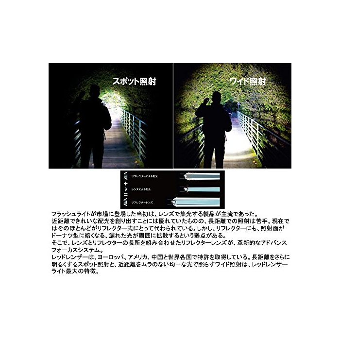 ※ 미국 휴대 전등 규격ANSI FL1에 기초해 기재 ※레드 렌 더《―시리즈》의 렌즈에 대해서/렌즈 외주로 보이는 백탁 하고 있는 개소는,렌즈의 파손은 아니고, 수지 성형할 때의 게이트(주입구)자국으로 당첨되는 부분입니다.이 게이트는 렌즈의 뒤편에 있고, 빛의 통과 루트로 영향 없고, 제품 기능상의 문제는 없습니다