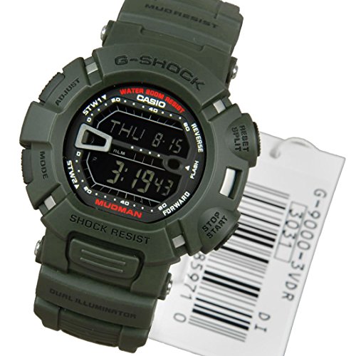Brand, Seller, or Collection Name:Casio Model number:G-Shock Part Number:g9000-3v Item Shape:Round Dial window material type:Mineral Glass Display Type:G-Shock Men's Watch G-Shock Mudman G-9000-3VDR - WW Clasp:Buckle Case material:Resin/Stainless Steel Case diameter:32 millimeters Case Thickness:16 millimeters Band Material:Dark Green Resin Band Band width:26 millimeters Band Color:Green Dial color:Black Special features:G9000-3V Item weight:1.92 Ounces Movement:Quartz Water resistant depth:200 Meters