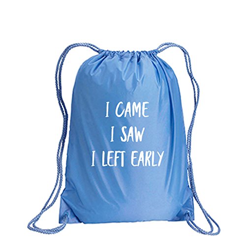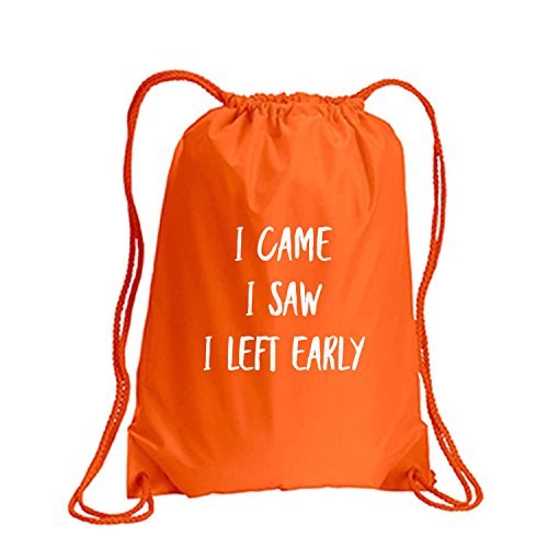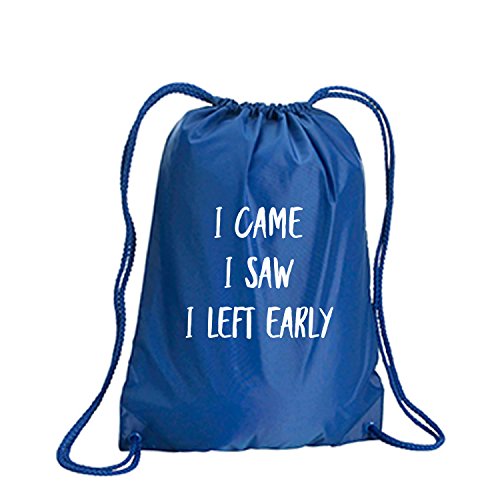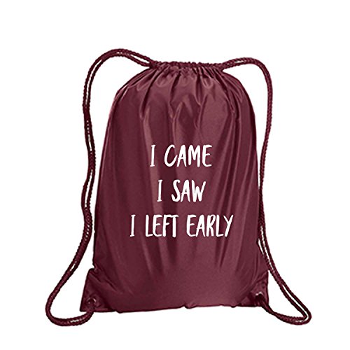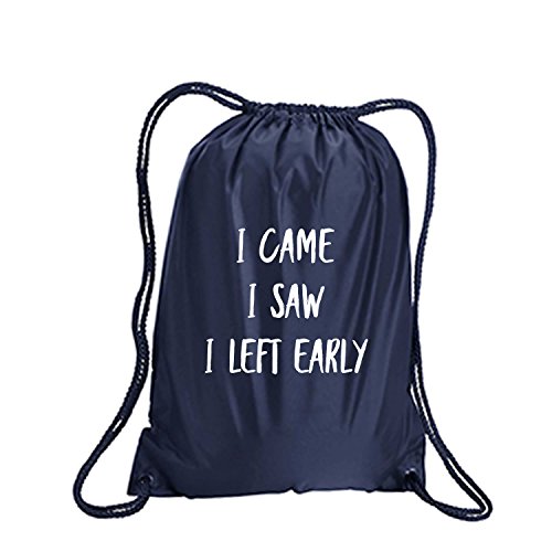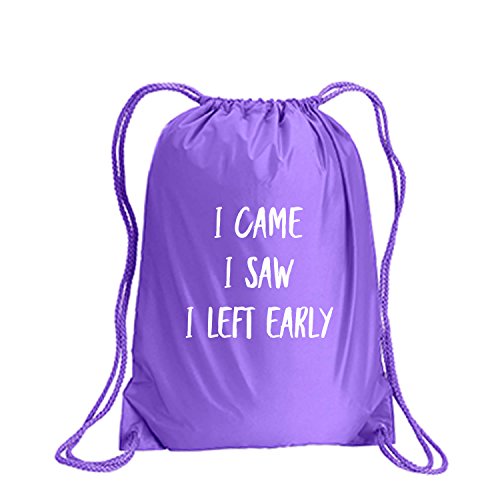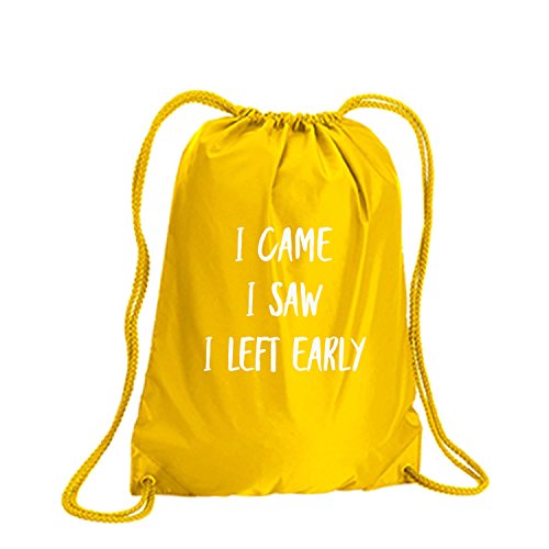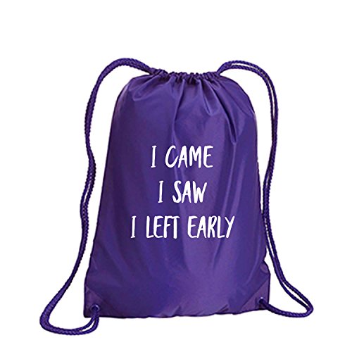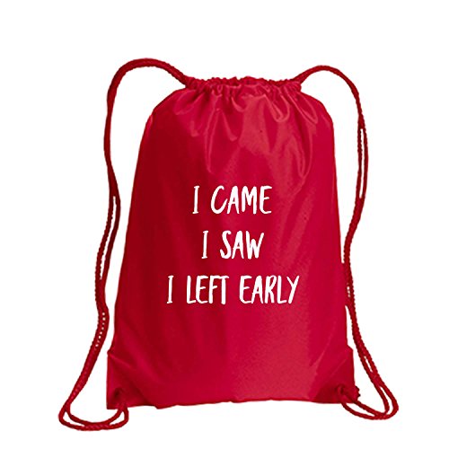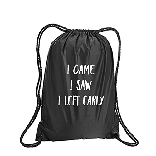 Product Description This durable and stylish nylon tote features "I Came I Saw I Left Early" on a cinch pack tote with white ink. Bag comes in small and large sizes and is made of a durable 210 Denier nylon and has color-matched draw cords. Printed in the USA on an imported bag. 0