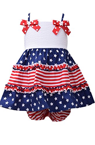 -. Feature : Adorable dress from Bonnie Baby (line from Bonnie Jean). / The blue straps dress features white seersucker bodice, red dotted bows and star buttons trim at each front side, red/white/blue ribbon trim on poplin block skirt, elastic back for better fit. / Made of 100% Cotton, and machine wash cold. / Comes with matching red/white striped bloomer. / A terrific dress to be worn during 4th of July/summer occasions.
