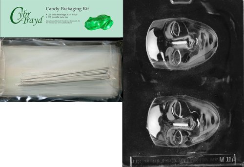 Cybrtrayd Face Mask Miscellaneous Chocolate Candy Mold with Packaging Bundle of 25 Cello Bags, 25 Silver Twist Ties and Chocolate Molding Instructions