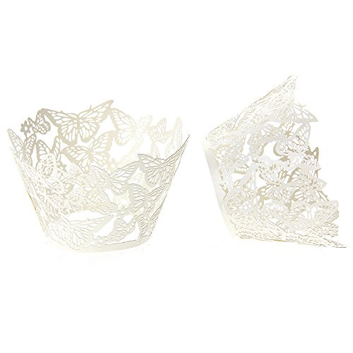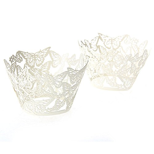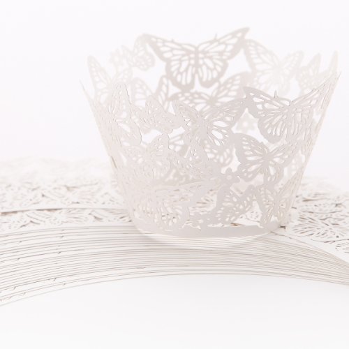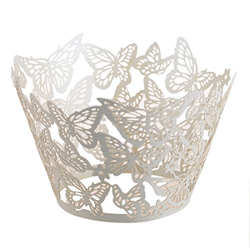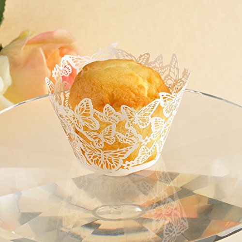 Derker 50 Pcs Laser Cut Cupcake Collars Butterfly Cupcake Wrappers Wraps Wedding Birthday Baby Shower Party Cupcake Decorations (White)