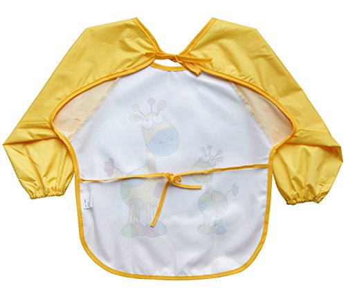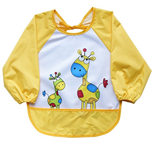 Leyaron Unisex Infant Toddler Baby Waterproof Sleeved Bib, Blue Car and Yellow Giraffe, Set of 2, 6 Months-3 Years