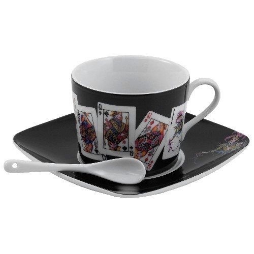 -. Feature : Service for 2: Includes 2 cups, saucers, and spoons / Porcelain printed with playing cards in Queens and Jokers / Extra-wide mugs and saucers for style and stability / Microwave safe / Dishwasher safe