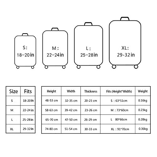 -. Feature : 1.Protector with High Quality Fabric : Spandex , elastic , thick , flexible , stretch , soft . It is made of 95% polyester and 5% spandex (We are just selling the suitcase cover instead of suitcase). / 2.Washable, Durable, Elastic, Protect your suitcase against dirt and scratch. Hightlight your personalized, it can make you find your suitcase in a large number of suitcases quickly, saving your time / 3.Superior sublimation quality makes the pattern more vivid and the color brighter. / 4.We only sell the lage covers WITHOUT SUITCASES. And if you would like open or close your lage, you need remove the lage cover. This design is in order to avoid the lage being opened by itself accidentally then cause your lage drop / 5.Lage Covers Have Four Size Design : S Size:18-20 inch lage cover , M Size: 22-24 inch lage cover , L Size: 25-28 inch lage cover , XL Size: 29-32 inch lage cover . It can fit most brand suitcase perfectly
