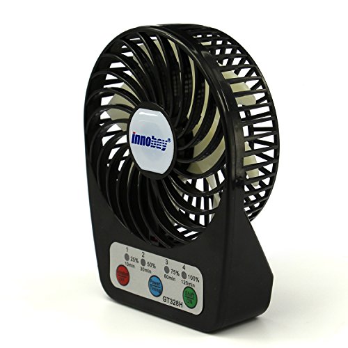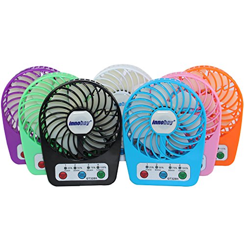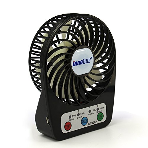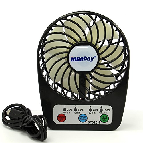 - Feature : Portable mini fan powered by Built-in lithium battery; convenient to carry anywhere and anytime. / Battery status visible and 4 settings of time function; 4 air flow speed: high, mid, low and mild. Upon your choice, the fan works from 2-10 hours after fully charged. / Different ways to charge fan with lithium battery in: connect micro USB charging cable via computer/notebook, car charger, power bank, 5V wall USB charger, 5V solar charger etc. / 100% pure copper brushless motor makes GH328H fan working 10000 Hours lifetime, high energy conservation. / BUY 2 SAVE 25%; INNOBAY 2015 new design, exclusive sale. Superior Quality: cutting-edge circuitry and a sturdy gloss ABS plastic exterior ensure reliability and safety.
