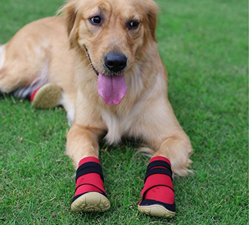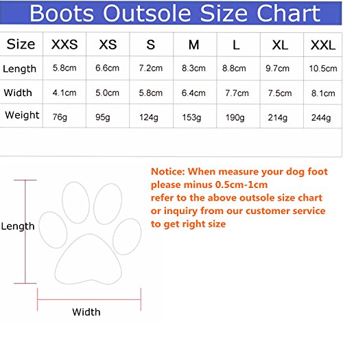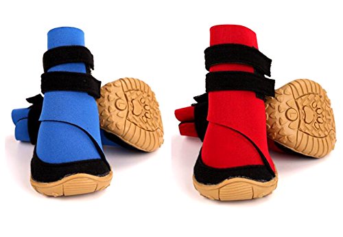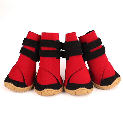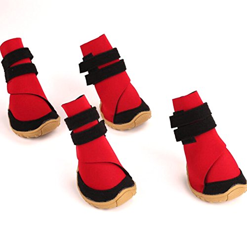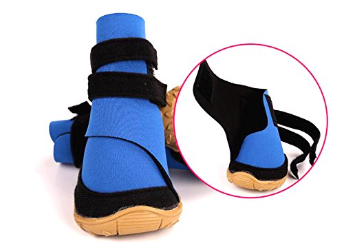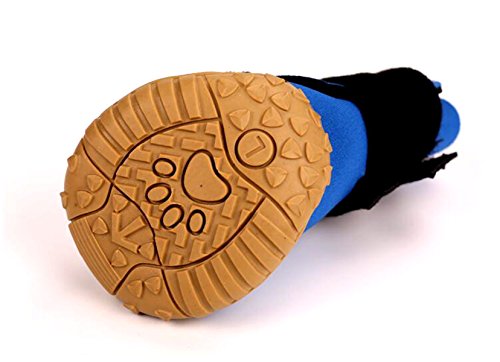-. Feature : Material: Neoprene surface and sturdy rubber sole, lining fleece / With velcro straps closure, for better size adjustablility. Please carefully check the size chart before select it for your dog. / Water resistant material,flexible,skid-resistant and waterproof sturdy soles, anti-slip, capable to keep debris out, not only bring more comfort / Keep your love dog clean when they running outside, but also keep their paws warm and walking on snow safty in winter / Package Content: 4pcs dog boots