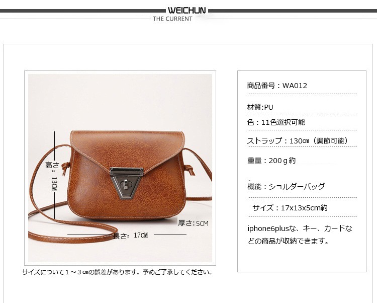 商品番号:WA012商品説明:◆伸縮性:有り◆厚さ:普通◆素材:PU、ポリエステル、金属◆バッグのサイズ:長さ:17cm約 厚さ:5cm約 高さ:13cm約 ストラップ:130cm約(調節可能)◆色:ワインレッド、ブラック、ピンク、ダークブラウン、ライトブラウン、ゴールデン、シルバー、ライトグリーン、ダークグリーン、グレー、ベージュ◆重量:200g約◆商品内容:1xバッグ特徴:【軽量、携帯便利】小さいサイズなのですが、軽量で、携帯便利です。出掛けに最適!!コンパクトサイズのショルダーバッグ。内ポケット付きです。【ファッションなデザイン】欧米風な純色のファッションのバッグなので、通勤や通学にも適用します!!【多彩な色】十一種類な色を選択可能です。簡単的にファッションなデザインのカバンです。おすすめです。