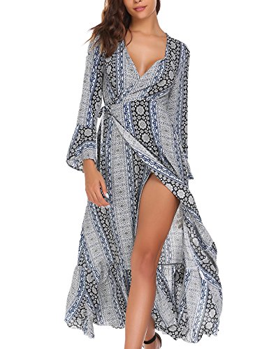 -. Title : SE MIU Women's Boho V Neck Floral P.R.Int Tie-Waist High Slit Wrap Maxi Dress