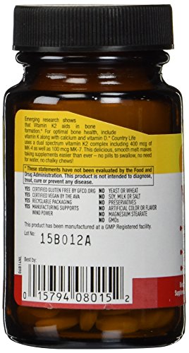 -. Binding : Health and Beauty -. Brand : Country Life -. EAN : 0015794080152 -. Feature : Country Life -. IsAdultProduct : 0 -. Label : Country Life -. Manufacturer : Country Life -. MPN : 8015 -. NumberOfItems : 1 -. PackageQuantity : 1 -. PartNumber : 8015 -. ProductGroup : Health and Beauty -. ProductTypeName : HEALTH_PERSONAL_CARE -. Publisher : Country Life -. Size : 60 -. Studio : Country Life -. Title : Vegan K 2 Country Life 60 Smooth Melts -. UPC : 015794080152
