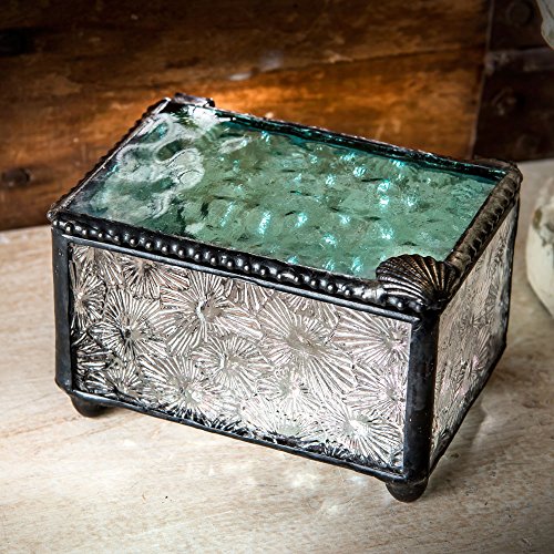 -. Feature : Stained glass keepsake box for the perfect beach decor / Clear and aquamarine blue stained glass with a sea shell metal filigree accent / This glass box is perfect to display your jewelry, trinkets and keepsakes / Handcrafted stained glass jewelry box made with lead free solder to protect you and the environment / Designed and Manufactured by J Devlin Glass Art 3 1/4 X 2 1/4 X 2 1/4