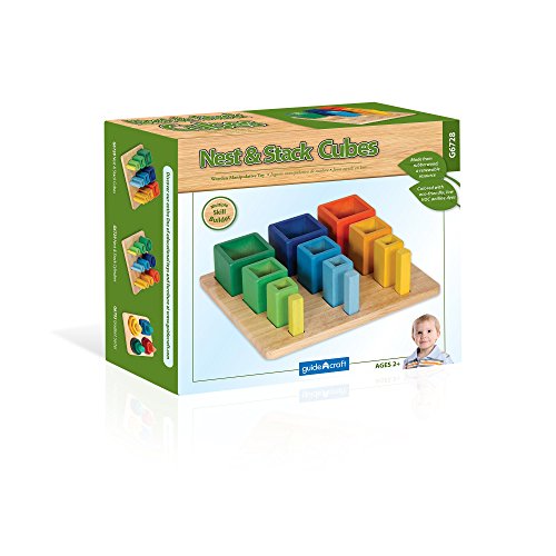 The unique design of this wooden manipulative allows for several exciting ways to play and learn. The brightly colored cubes are graduated in size and nest together, inspiring exploration and promoting fine-motor and shape-recognition skills. Also, each series of shapes feature colors that range from primary to pastel: as the pieces get smaller, the colors get lighter. Ages 2+. 8"L x 9"W x 3"H.Feature