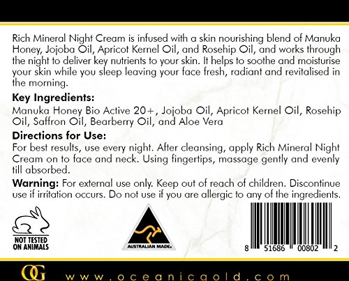 Rich Mineral Night Cream works overnight to restore and refresh your skin's radiance. Manuka Honey, a natural humectant that draws moisture into the skin, is infused with skin nourishing Jojoba Oil, Apricot Kernel Oil, Rosehip Oil, Rose Bulgarian Floral Water, Aloe Vera Juice and Geranium oil. Bearberry Oil is also added to give you a fresh, supple and brighter look. This incredible combination of natural and nourishing ingredients is absorbed by your skin during your resting hours so you wake up to fresh, plump and dewy skin in the morning.Made with no Sulfates, Parabens or Phthalates.Feature
