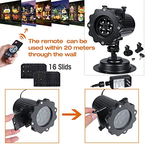 -16 different colorfast interchangeable slides, heart shape, snowflake, Santa, christmas tree, pumpkin, ghost, gift, skull, santa, snowman, star. Ideal for indoor and outdoor.