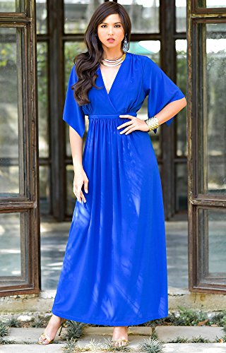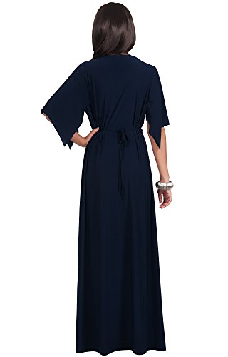A stunning new caftan styled cocktail maxi dress with sleeves from Koh Koh that is the perfect evening dress. These beautiful designer caftan inspired maxi dresses are featured a v-neck front with half-short sleeves that cover just the top of the arm. The caftan styled cut provides for the perfect fitting as you simply tie the waist bands at the back of the dress to your perfect fit. Due to the position of the high waist-band, the dress has a generous empire waist and can be used as a maternity maxi dress, maternity dress, pregnancy dress or a lovely baby shower dress. These versatile maxi dresses are available in color Navy Blue and Plus Size 2X Large / XXL / 18-20.