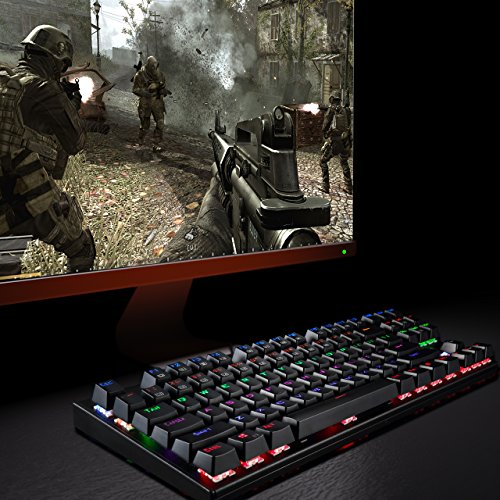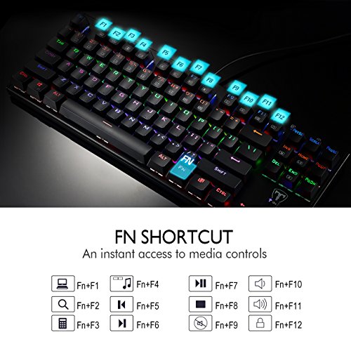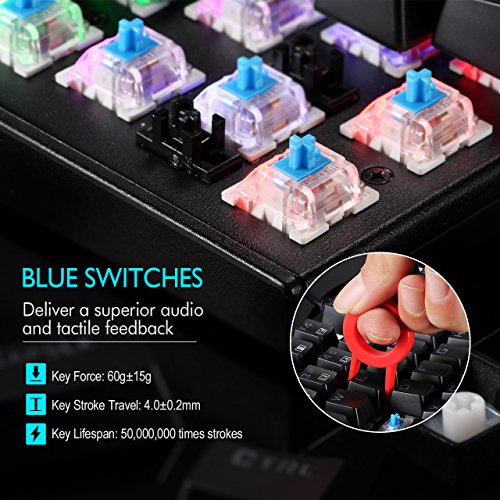 BLUE SWITCHES, GAMING-GRADE RESPONSIVENESS. Deliver a superior audio and tactile feedback. 50 million times keystroke test, 60+/-15 grams key force and 4.0+/-0.2mm stroke travel. Perfect for typist, programmer, writer, gamer and etc.