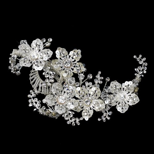 Product Description A glamorous floral bridal hair clip that is simply stunning. Featuring sparkling rhinestones encrusted on a beautiful silver plated floral design with radiant sequins and Swarovski crystals beads. This gorgeous hair clip is an absolute eye catcher and a truly magnificent accessory piece to complete your bridal looking. Size: 5" (Length) 3.25" (Width). 0