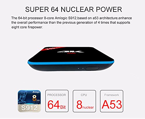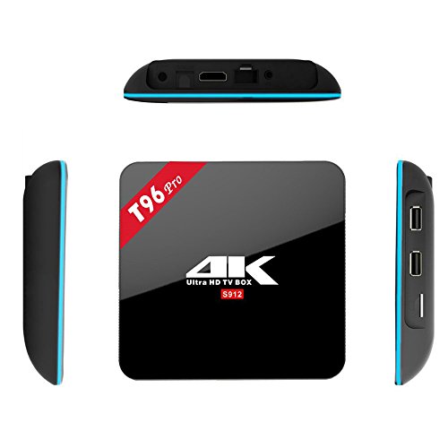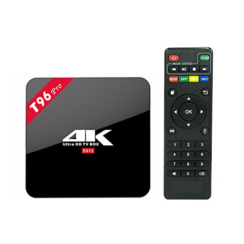 -. Feature : T96 pro smart tv box with a newest and open platform Android 6.0 Marshmallow, pre-installed with a media center software that enables you to play all your video and audio files on your TV . No more watching them on a small PC screen / The XBMC KODI 16.1 is pre-installed, all of add-ons are pre-loaded in it, you just click to install the ones you want, and then turn your TV into Smart TV. You can start streaming , enjoy all your favorite movies/shows, and you also can play thousands of android games in a large screen smoothly / Professional H.265 video decoding technology and WIFI 2.4GHZ and 5.8GHZ, Bluetooth 4.1, offering a more stable WIFI signal to enjoy a higher quality video experience! / The latest powerful chipset Amlogic S912 Octa-Core ARM Cortex-A53 64-bit @2GHz, Mali-T820MP3 GPU@750MHz, also with 3GB RAM 16GB EMMC, Miracast/DLNA,higher processing speed, more space to storage / Package:1* T96 PRO TV BOX;1* Power Adapter;1* Remote Control;1* HDMI Cable;1* User Manual