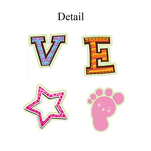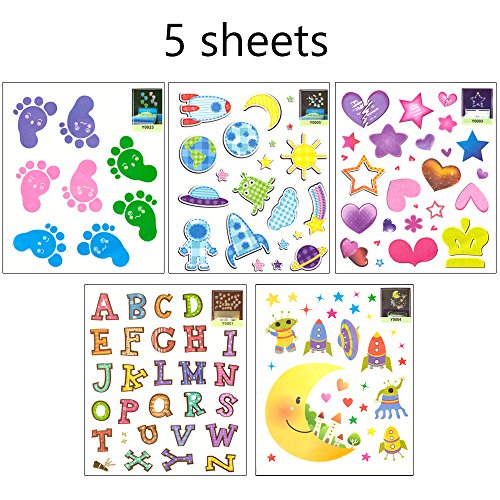 MULTI SIZES OF PIECES: 114 PCS stickers in total. Our glow in the dark stickers contain 5 sheets of stars, hearts, alphabets, footprints, moons, spacecrafts & planets in different sizes & types