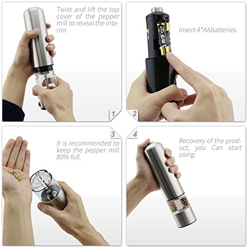 - 【Battery Powered 】 Powered by 4 x AA batteries (not included), it can grind salt and pepper automatically, quickly and efficiently.