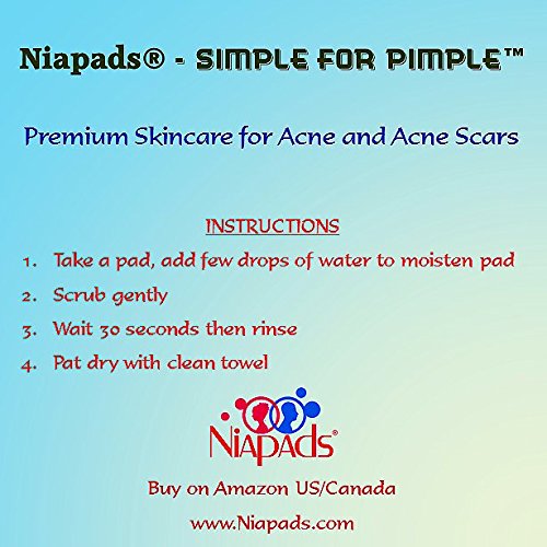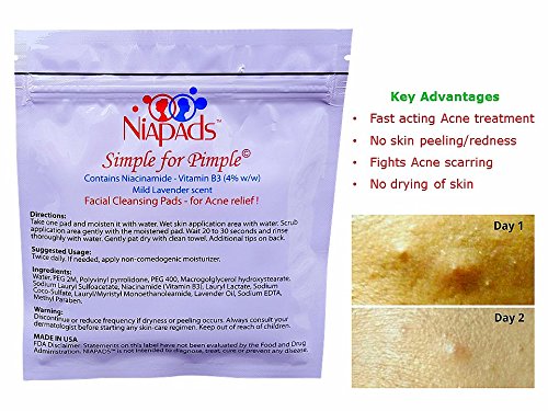WHAT is NIAPADS®: Fast acting ANTI-ACNE Niacinamide (Vitamin B3 pads) for BLEMISH FREE CLEAR SKIN. These pads contain skin friendly Niacinamide and Lavender Oil. Suitable for all skin types - combination, oily or dry. Niacinamide is also known as Vitamin B3. HOW TO USE: Suitable for all types of body Acne - face, back, shoulders & neck. Pads may be cut to desired size. Add drops of water on the pad to activate skin friendly ingredients. Choose your method: 1. Gently scrub away oily skin residues and open clogged skin pores, exfoliate away blackheads, whiteheads, pimples and zits. 2. Spot treatment - Just take a pad, add drops of water and place it on Acne surface. When dry, peel and rinse - it is that simple. Repeat as often as needed. SUPERIOR PERFORMANCE: Niacinamide (pads) will not rub away - unlike other lotions or serums. Outperforms products containing Salicylic acid and Benzoyl peroxide. REDUCED SKIN HYPERPIGMENTATION: Niacinamide (pads) is nature's remedy to Acne and the redness and scars it leaves behind. Our proprietary formulation helps lighten dark skin pigmentation and brown spots. INCREASED SKIN HYDRATION: Niacinamide benefits your skin by improving skin cell barrier function, jumpstarting circulation and increased elasticity due to skin hydration. Minimizes skin wrinkles and fine lines. OUR 100% SATISFACTION GUARANTEE: As a family company, we only produce products we are proud to use ourselves. Order Today RISK FREE with our 30-Day, 100% Money-Back Guarantee, you can buy with confidence! 30 pads per pack. Travel friendly. No messy Liquids. MADE IN USA!Feature