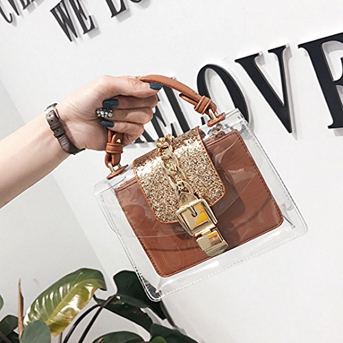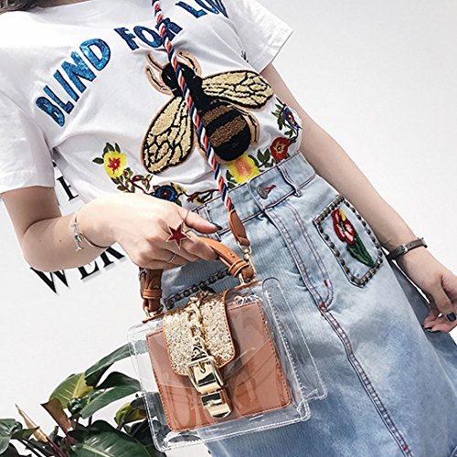 -. Feature : Transparent tote made of thick PVC and sturdy PU leather, braided clothes shoulder strap, practical and durable / Purse Dimension (L x W x H): 7.1 x 3.1 x 5.5in/18 x 8 x 14cm, Shoulder strap length: 47.2in/120 cm, a perfect size for daily use / The shining sequin oranment decored at the front and back of bag, truly gorgeous and brilliant; covered with the golden chain belt, to show your excellent taste, the chic and stylish fashion makes you stand out in the crowd / Braided shoulder strap, three lovely colors blended together, casual leisurely design, a pretty accessory for girls and ladies; stuck PU top handle, cloth strap, comfortable to hold in hand or carry on shoulder, can be used a tote handbag, clutch, a shoulder or crossbody bag for many uses / Unique 2 in 1 style design, one purchase for a clear jelly bag and a small zipper purse with a reasonal P.R.Ice, useful and practical; the transparent PVC main bag, water resistant and sturdy, ideal for beach trips and pool, with the inner pouch to conceal your personsal stuffs, suitable for gem, travel, school, shopping, etc