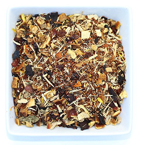 -. Feature : Ingredients: Red rooibos, ginseng, Tulsi (holy basil) lemon peel, orange peel, hibiscus, ginger root, rose hips, cinnamon, rose petals, marigold flowers, orange, vanilla flavoring. / Our caffeine free Immunity Buster is not only packed with delicious fruit and flower flavours, but is also especially formulated to help to lower your stress levels and give your immune system a natural boost. / This hand prepared rooibos tea-based herbal blend will warm and comfort the body while enlivening the senses. / Immunity Buster's ginseng and rooiboos provides a natural antioxidant boost, while it's naturally high levels of vitamin C help your body to prepare for battle against viral nasties such as coughs and colds. The perfect drink for any time you feel a cough or cold developing, or to top up your vitamin levels every day. / 4oz / 111g zip lock pouch