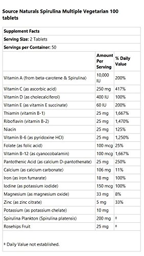 Studio : Source Naturals Publisher : Source Naturals Binding : Health and Beauty Product Description This special blue green algae (Spirulina platensis) is a low fat source of numerous vitamins, minerals, carotenoids, and essential fatty acids and an excellent source of many nutrients. Spirulina’s cell walls do not contain cellulose to slow down digestion. Spirulina supplies all nine essential amino acids including those containing sulphur. Source Naturals Spirulina Multiple™ combines spirulina with additional vitamins and minerals to provide a day’s worth of nutrients in just two tablets. 0