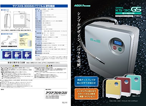 -. Feature : 商品名:サナスKS-30GS / 内容:管理医療用機器還元水連続生成器 / カートリッジ交換期間:1年 / 寸法:幅250mm×高さ308mm×奥行135mm / 標準付属品:フレキシブルパイプ(長さ480mm)・シャワ付き分岐栓・フィルター交換ラベル・吸盤(1個)・アダプターセット(外ネジ用アダプター・内ネジ用アダプター・丸型蛇口用アダプター・取り付け具)・pH試験液セット(pH試験液・専用カップ・pH比色紙表)・グリセロリン酸カルシウム(3g)・取り扱い説明書・保証書