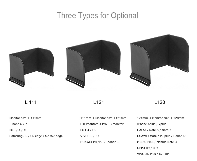 This sun hood for is designed to keep out hot sun glare of your phone screen when flying. It is very light weight, foldable, easy to carry when do not use. It can be used for DJI phantom all versions, include phantom 3/4 and DJI Mavic pro Osmo, just varies in the size of phone.