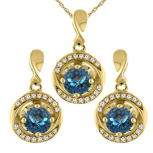 -. Binding : Jewelry -. Brand : Sabrina Silver -. Department : womens -. Feature : 14K Solid Gold / Naturally-vibrant, superior quality color gemstone / High Quality Genuine Diamond Accents / Complimentary gold chain included -. ProductGroup : Jewelry -. ProductTypeName : FASHIONOTHER -. Title : 14K Yellow Gold Natural London Blue Topaz Earrings and Pendant Set with Diamond Accents Round 4 mm