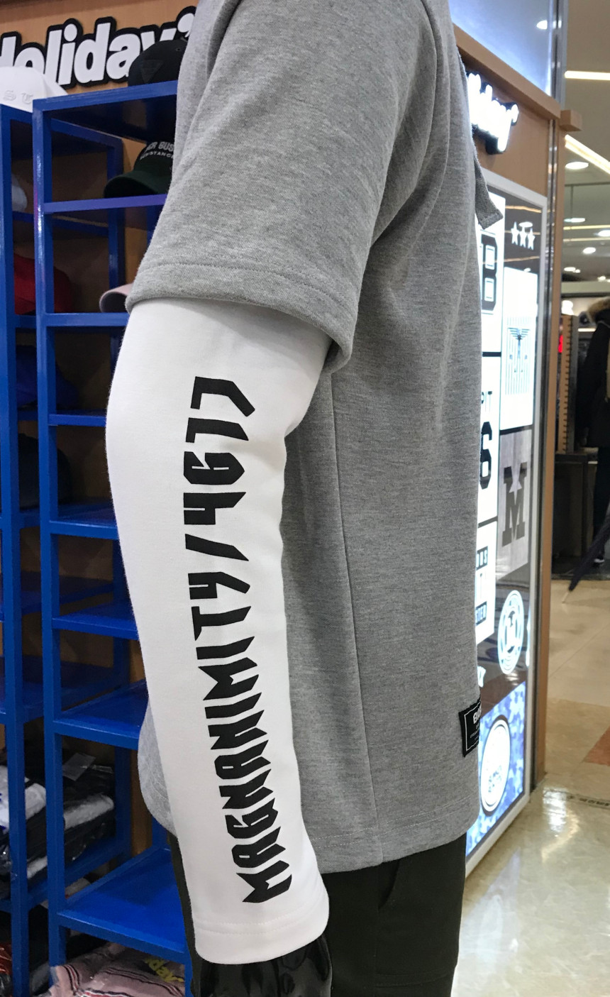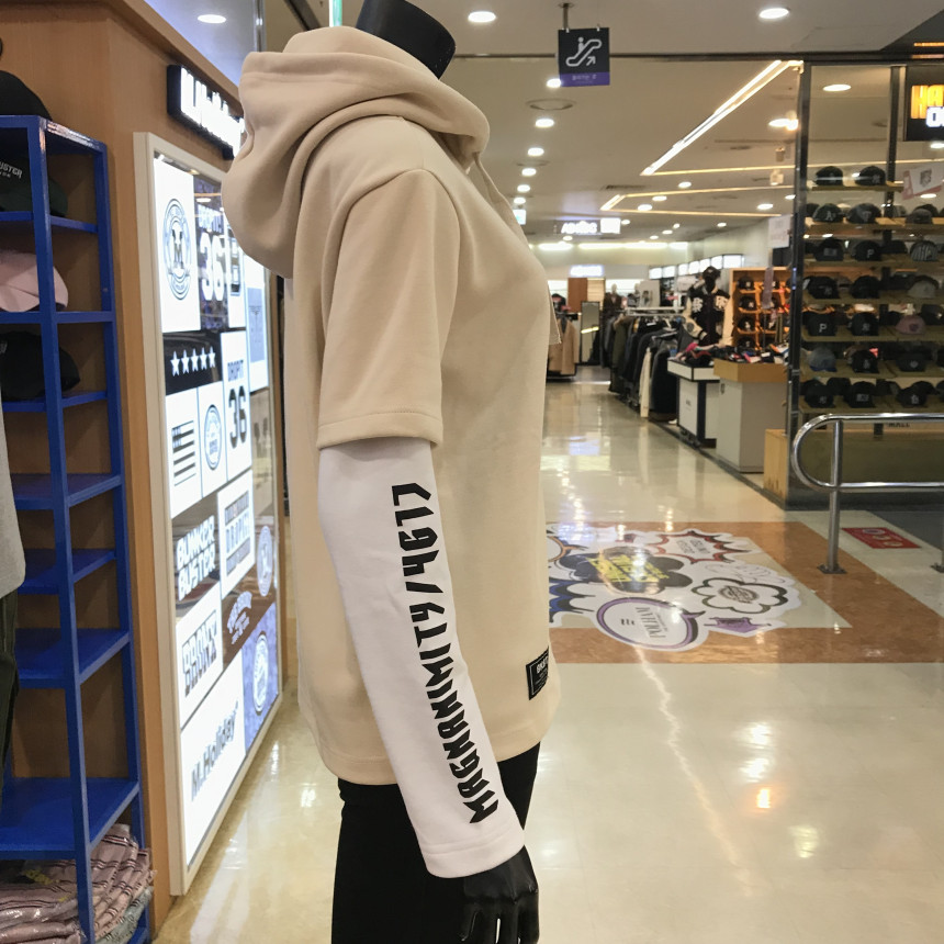 엠할리데이 남녀공용 소매 레어이드 후드 티셔츠입니다.