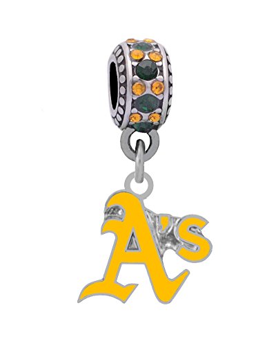 -. Feature : Oakland Athletics Charm with Connector Bead Fits Most Large Hole Bead Bracelets like , Kays, Chamilia, Biagi, Troll / The slide on bead connected to the charm is stainless steel with black and gold crystals. It will not rust or tarnish / Charm is a semi-cloisonné' design with a hard enamel finish / Charm is a base metal, lead and nickel free ~ 1/2" x 5/8" / Available for immediate USPS shipping from Oak Ridge, TN