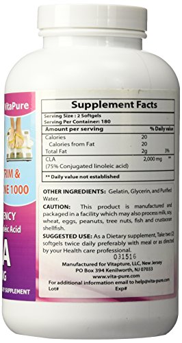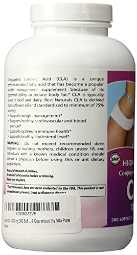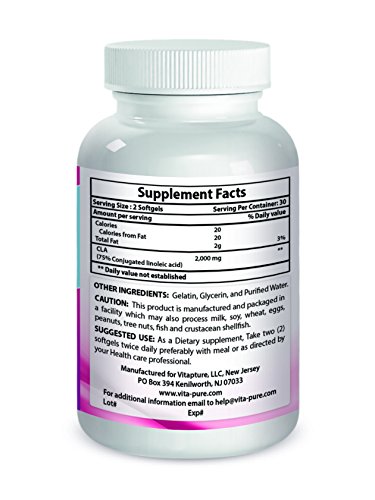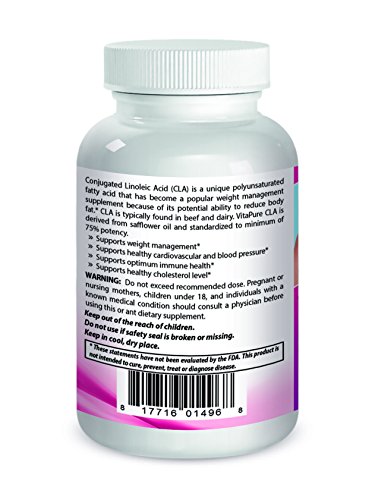 -. Binding : Health and Beauty -. Brand : Vita Pure -. Label : Vita Pure -. Manufacturer : Vita Pure -. ProductGroup : Health and Beauty -. ProductTypeName : HEALTH_PERSONAL_CARE -. Publisher : Vita Pure -. Studio : Vita Pure -. Title : Pure CLA 1000 mg Supplement, Best Premium Quality ★ Highest Grade Safflower Oil (Best Formula) - 1000 Mg ★ All-natural & Guaranteed By Vita Pure